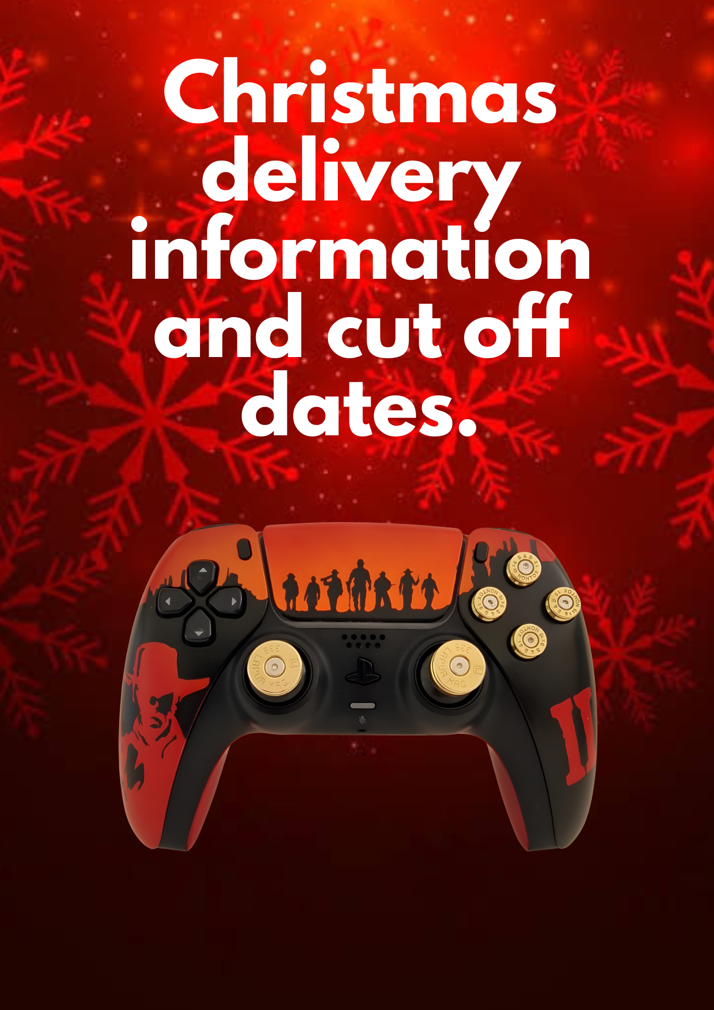 Country cut off dates will be avaiable soon but in the mean time all orders as of the 10th of October will be considered as a delivery for Christmas, this is due to the high demand and the time taken to create hand painted controllers. If however the controller you order is for a gift or Birthday as long as it is within my 30 business days build time I will make sure it is done so please contact me via undeadgaminguk@gmail.com.